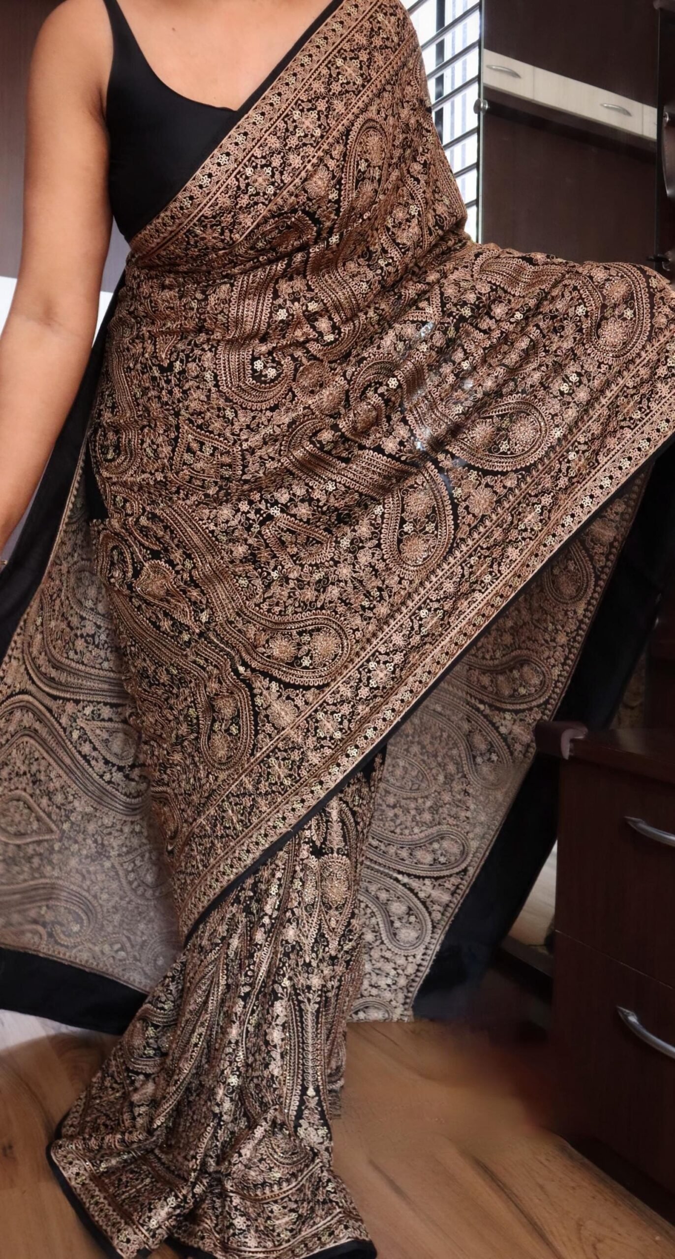 *As Zarkan intricate work and SWAROVSKI stonework with delicate kani embroidery accentuated with heavy jaal on pure georgette saree*